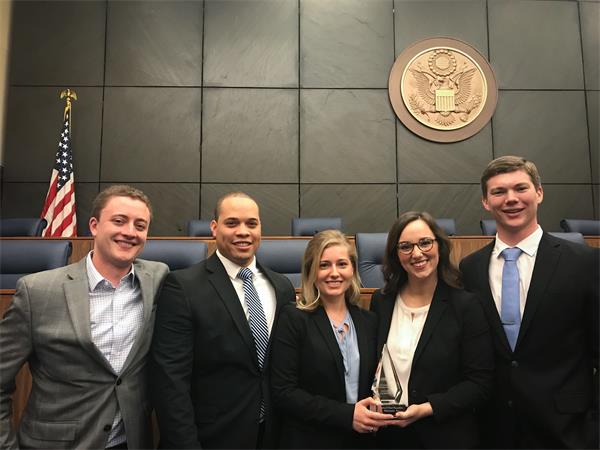 (Pictured, Campbell University’s Norman Adrian Wiggins School of Law AAJ National Championship Team in the James A. Byrne Courthouse.  Left – Jacob Morse, AAJ member and STAC volunteer).
